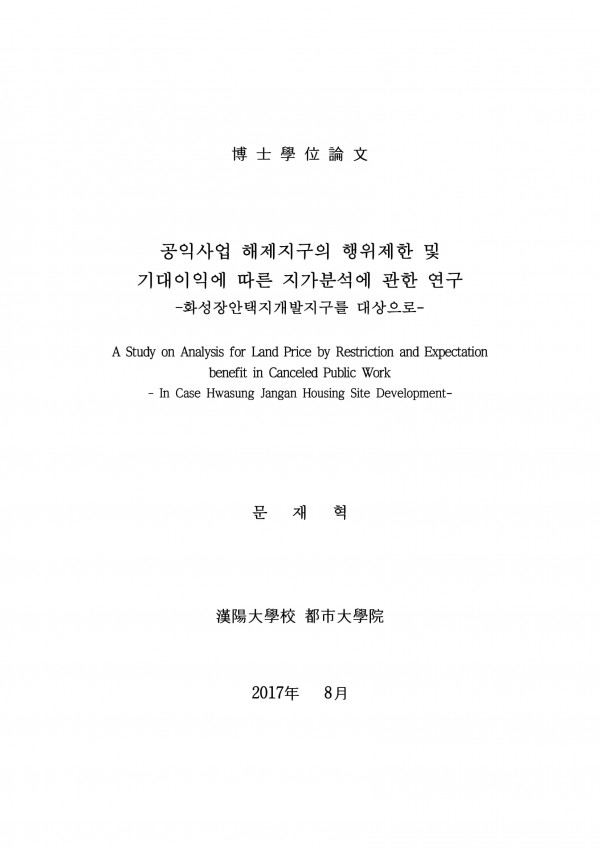 공익사업 해제지구의 행위제한 및 기대이익에 따른 지가분석에 관한 연구 > thesis